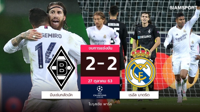 เรอัล มาดริด รอดตายอย่างเหลือเชื่อทั้งที่สกอร์ตามหลังเจ้าบ้าน กลัดบัค 0-2 ทว่าช่วงท้ายเกม มาได้สองประตูรวด และเป็น คาเซมีโร่ ที่จ่าย1และยิงประตูชัยพาทีมไล่ตีเสมอ 2-2 อย่างระทึก เก็บแต้มแรกในแชมเปี้ยนส์ ลีก ฤดูกาลนี้สำเร็จ สนาม : โบรุสเซีย พาร์ค โอกาสลุ้นหนแรกของ "ราชันชุดขาว" ต้องรอถึง นาทีที่ 16 ลูกัส บาซเกซ เปิดมาให้ คาริม เบนเซม่า กดด้วยขวาเหินคานออกไป ลูกทีมของ ซีดาน ยังปั้นเกมรุกโจมตีเข้าใส่ได้มากกว่า นาที 22 บอลโต้กลับขึ้นมา เบนเซม่า ไหลให้ วินิซิอุส จูเนียร์ ฉีกไปซัดด้วยขวาบอลพุ่งไปติดบล็อค นิโก้ เอลเวดี้ แนวรับสิงห์หนุ่มออกหลัง ชุดขาวยังดาหน้าบุกใส่เจ้าถิ่นต่อเนื่อง นาที 29 เกือบได้ลุ้นขึ้นนำหลัง โทนี่ โครส ซัดนอกกรอบไปติดเซฟของ ยานน์ ซอมเมอร์ ก่อนถัดมา คาริม เบนเซม่า จะโขกซ้ำแต่ยังโดน ซอมเมอร์ปัดออกหลังไปอีก แต่ทีมเยือนบุกเพลิน เจอจังหวะสวนกลับของเจ้าบ้านเล่นงานจนถึงเสียประตูในนาที 33 อเลสซาน เพลอา ครอสเลียดไปหน้าประตูให้ มาร์คุส ตูราม ยิงหนีมือ ติโบต์ กูร์กตัว เข้าไป เป็นโอกาสครั้งแรก และยิงเข้ากรอบครั้งแรกอีกด้วย ก่อนที่ VAR จะยืนยันให้ประตูเจ้าถิ่นส่งให้ มึนเช่นกลัดบัค ออกนำ 1-0 นาที 38 ทีมเยือนมีลุ้นตีเสมอ โทนี่ โครส แทงบอลทะลุให้ วินิซิอุส จูเนียร์ หลุดเข้าไปซัดมุมแคบเสาแรกแต่ยังไปติดมือ ยานน์ ซอมเมอร์ อีก จบครึ่งแรก มึนเช่นกลัดบัค ได้ประตูขึ้นนำ เรอัล มาดริด 1-0 ครึ่งหลัง นาที 58 สถานการณ์ของ เรอัล มาดริด แย่ลงไปอีกเมื่อมาสังเวยเม็ดที่สองให้ กลัดบัค ขึ้นนำ 2-0 บอลสวนกลับของเจ้าถิ่น ตูราม พาบอลขึ้นมาก่อนจะไหลออกขวาให้ สเตฟาน ไลเนอร์ ครอสมาหน้ากรอบถึง อเลสซาน เพลอา ซัดด้วย ขวาไปติดเซฟ ติโบต์ กูร์กตัวส์ ทว่าปัดไม่ดีมาเข้าทาง มาร์คุส ตูราม ที่ยืนอยู่ใกล้ๆ และไม่ล้ำหน้า ตามซ้ำเข้าไปไม่เหลือ เป็นประตูที่ 2 ของเจ้าตัวในเกมนี้ นาที 61 กลัดบัค เกือบได้ลุ้นเม็ดที่สาม หลัง ฟลอเรียน นอยเฮาส์ แทงบอลให้ อเลสซาน เพลอา หลุดเข้าไปซัด แต่ยังไปติดเซฟของ ติโบต์ กูร์กตัวส์ นาที 70 ซีดาน เปลี่ยนเอา เอแด็น อาซาร์ ที่เพิ่งหายเจ็บลงสนามไปเล่นแทน วินิซิอุส จูเนียร์ส และถอดเอา โทนี่ โครส ออกแล้วส่ง ลูก้า โมดริช ลงไปได้ อีก 4 นาทีถัดมา อาซาร์ ที่เพิ่งลงมา ได้โอกาสลุ้นคราวนี้ เบนเซม่า จ่ายบอลต่อมาให้ อาซาร์ กดด้วยซ้ายแต่บอลก็ยังไม่ตรงกรอบ ท้ายเกม นาที 87 เรอัล มาดริด มาพังประตูตีไข่แตกไล่มาเป็น 1-2 จากจังหวะโยนยาวไปเสาไกลให้ คาเซมีโร่ โขกชงเข้ากลาง คาริม เบนเซม่า อยู่ใกล้ๆ ตวัดยิงเข้าไป เท่านั้นไม่พอ เจ้าบ้านต้องมาโอดครวญทำแต้ม